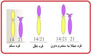 فرد حامل جابجایی رابرتسونیفقط دارای 45 کروموزوم است. با فرض اینکه این افراد دارای جابجایی کروموزم 14 و 21 باشند در کاریوتایپ آنها تنها یک کروموزوم 14 و یک کروموزوم 21 دیده می شود و به جای کروموزوم های 14 و 21 دوم تنها یک کروموزوم رابرتسونی 14-21 دیده می شود که در آن بازوهای بلند کروموزوم 14 و 21 به یکدیگر متصل شده اند. در این گونه افراد بر اساس مطالعات انجام شده حدود 15 تا 20 درصد خطر داشتن فرزند مبتلا به سندروم داون در هر بارداری وجود دارد.